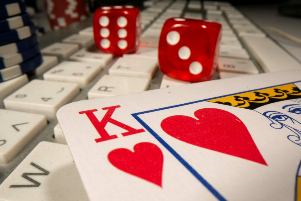 FILE PHOTO: Gambling dice, cards and chips are seen on the keyboard in this illustration picture, June 5, 2020. REUTERS/Dado Ruvic/Illustration/File Photo